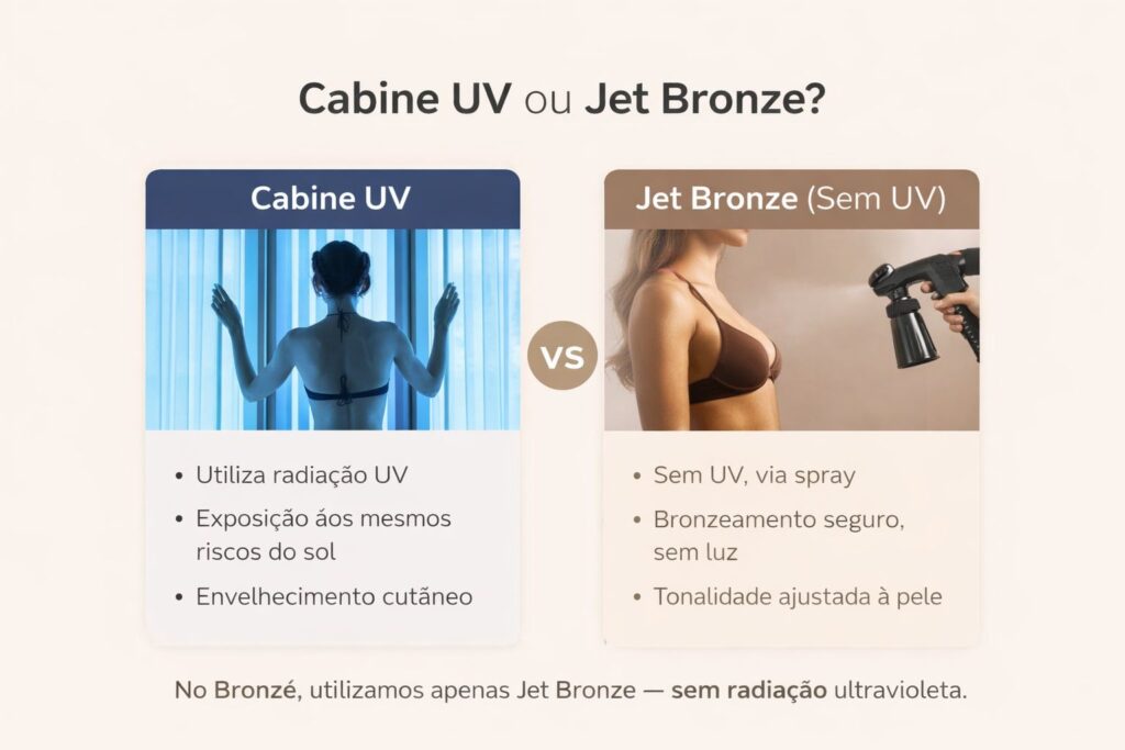 O Jet Bronze é um bronzeamento a jato (spray), totalmente diferente da cabine UV.